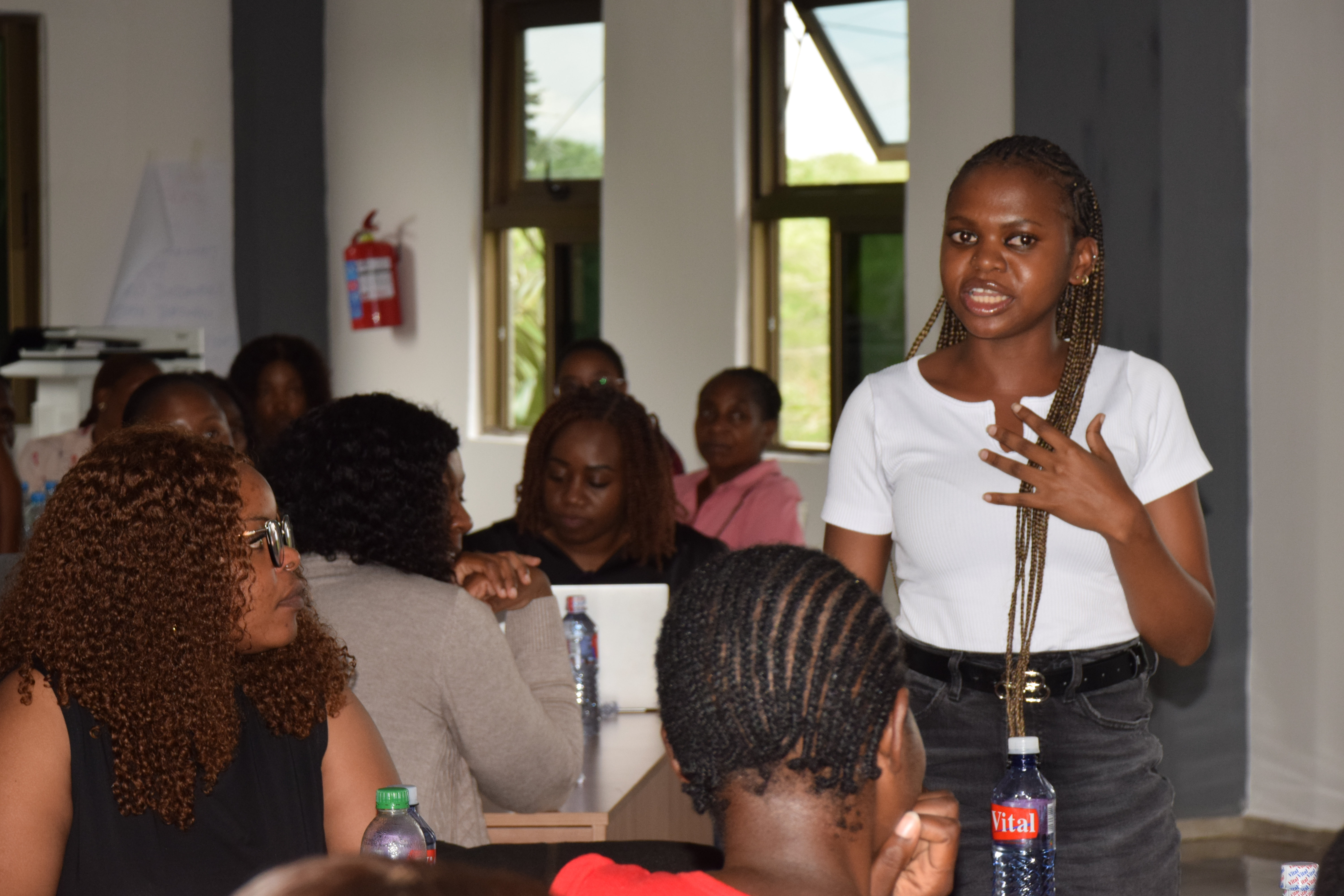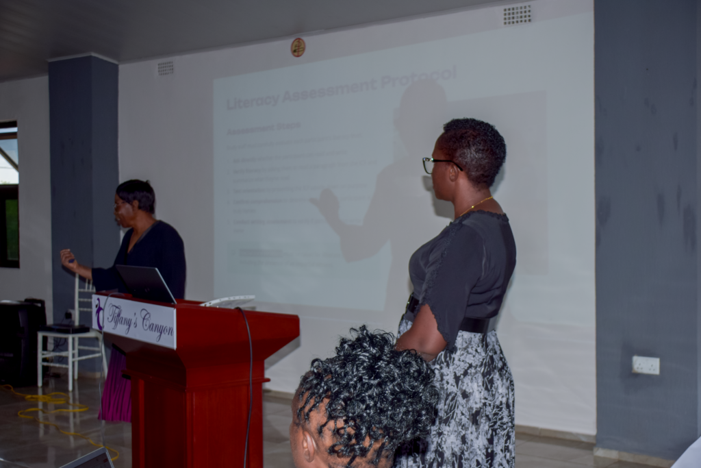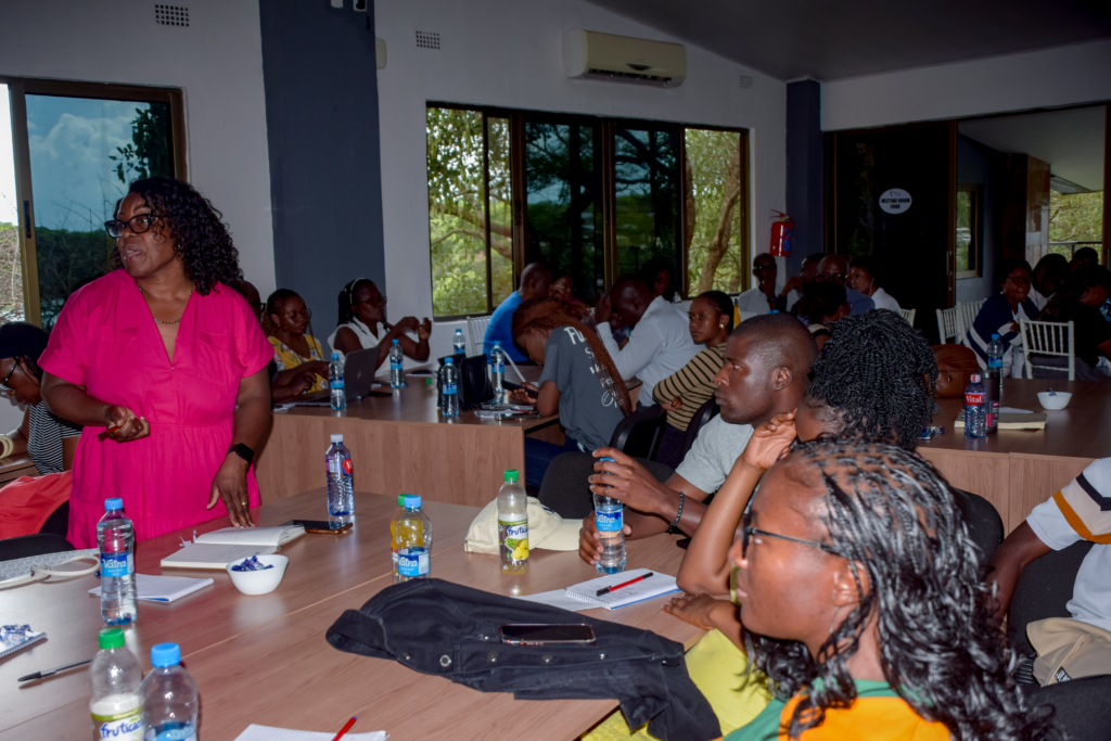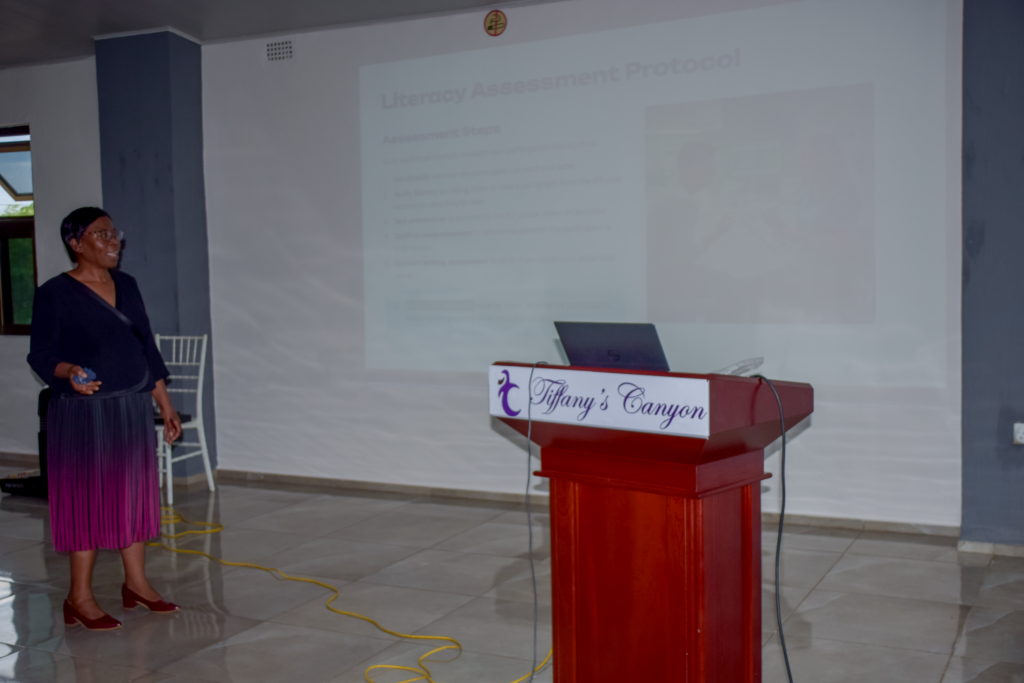Ms Beenzu Hamuhuma, Study Coordinator, delivering a presentation on informed consent processes and documentation during a staff training in Chilanga.